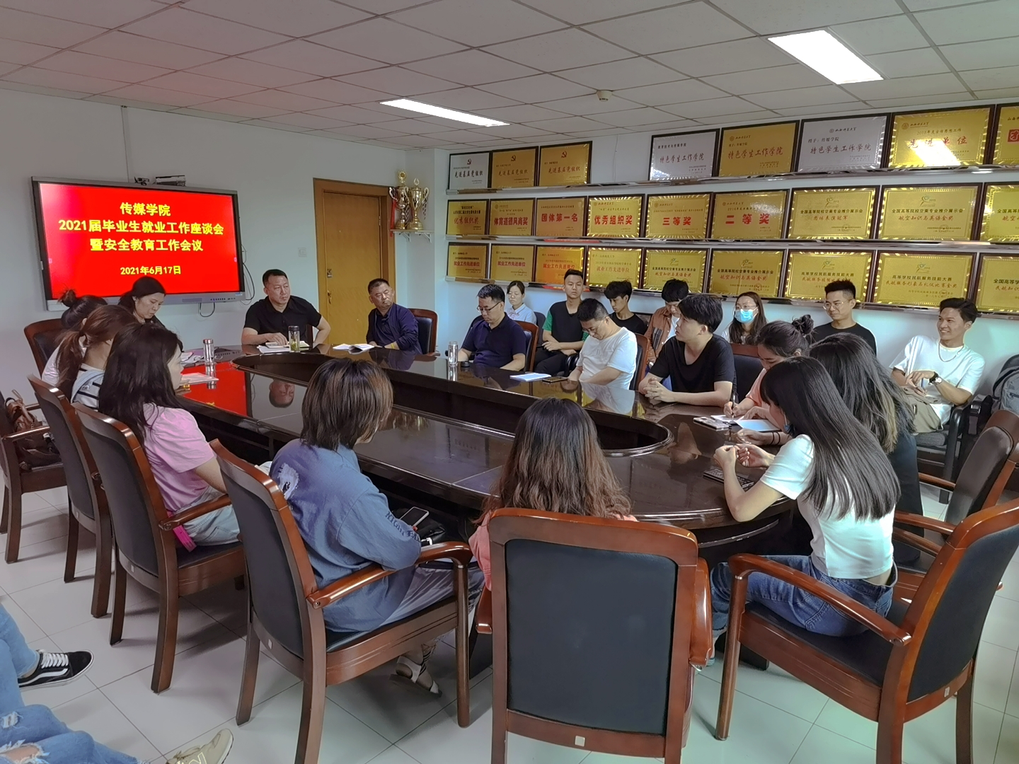 为扎实开展党史学习教育,认真落实“我为群众办实事”实践任务。6月17日上午,公司在科学会堂B座503会议室召开了2021届毕业生就业工作座谈会暨安全教育工作会议。公司党委书记靳晓涛、经理曹飞、公司党委副书记任茹新、副经理汪存友、编播系主任郝建国、毕业班辅导员郭梁和赵天喜出席了会议,2021届本科毕业生代表参加了本次会议。会议由公司党委副书记任茹新主持。