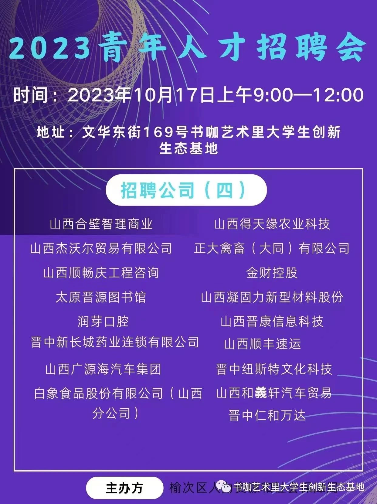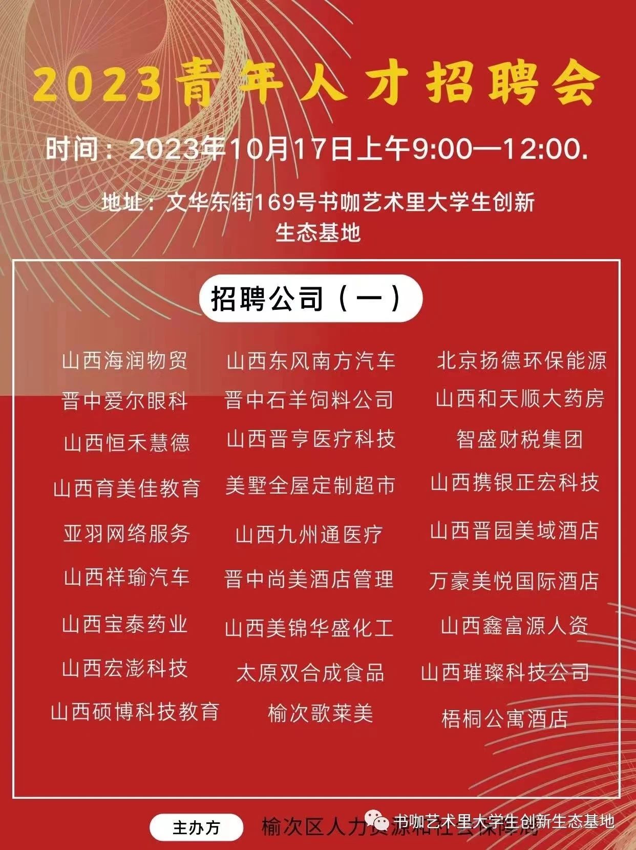 天美杉杉奥特莱斯、晋中仁和万达、梗阳实业集团、山西九州通医药、广源海汽车集团、爱尔眼科医院、顺丰速运、正大畜禽......百余家企业近2500个职位。