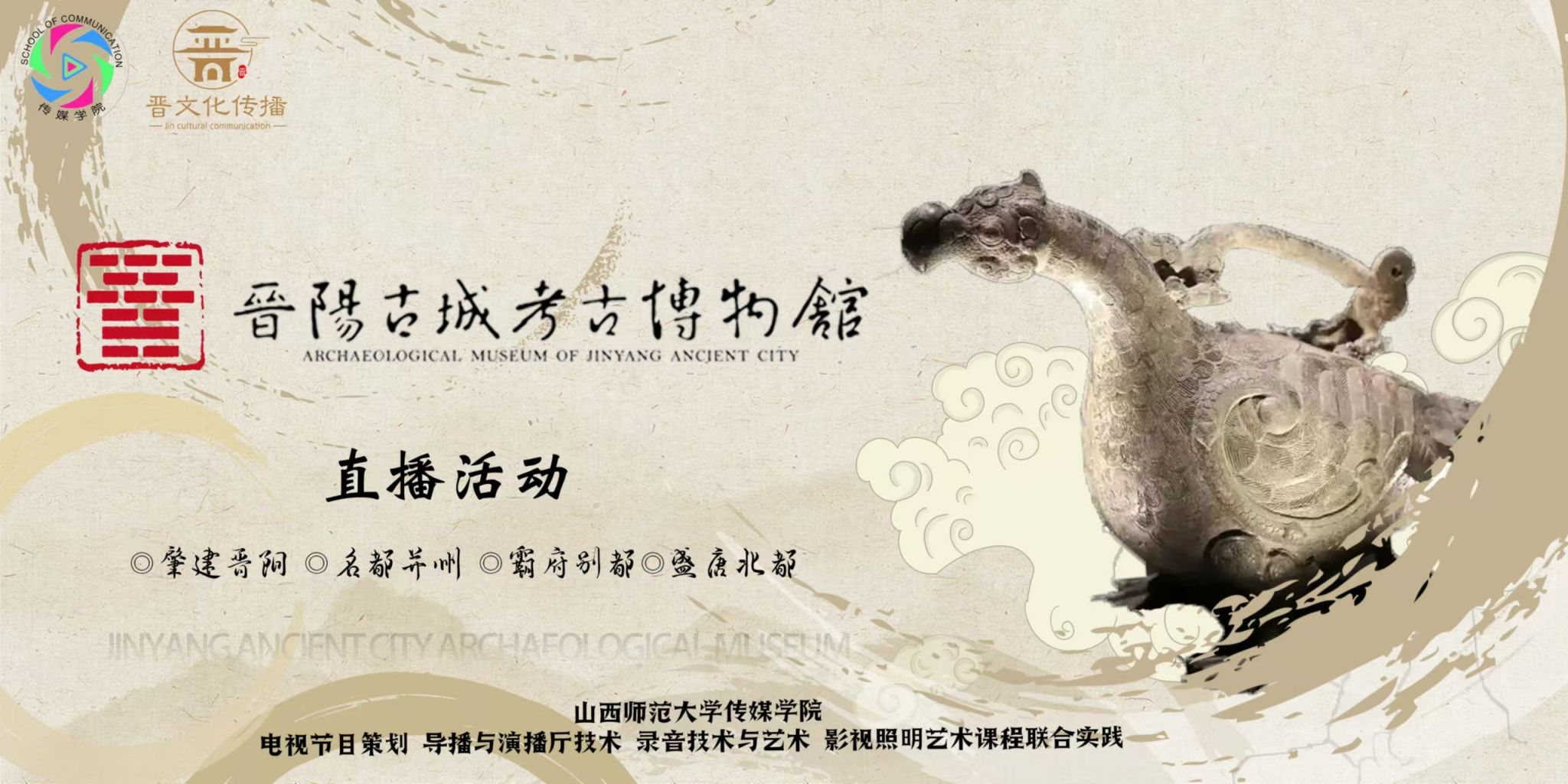 此次实践活动由电视节目策划、导播与演播厅技术、录音技术与艺术、影视照明艺术等四门课程共同完成,以践行“将课堂搬到现场”理念,通过直播“云游”博物馆,增强同学们的专业实践能力、团队协作能力和综合职业素养。活动中,同学们被分为四个小组,每组负责一个展厅的直播介绍。从“肇建金阳”的古老传说,到“名都并州”的繁华盛景;从“霸府别都”的历史变迁,再到“盛唐北都”的文化瑰宝,每个展厅直播都体现了专业教学与文化旅游事业的有机融合。为了确保直播的顺利进行,同学们在前期进行了充分的准备,不仅多次到博物馆实地考察,还进行了多次模拟演练。