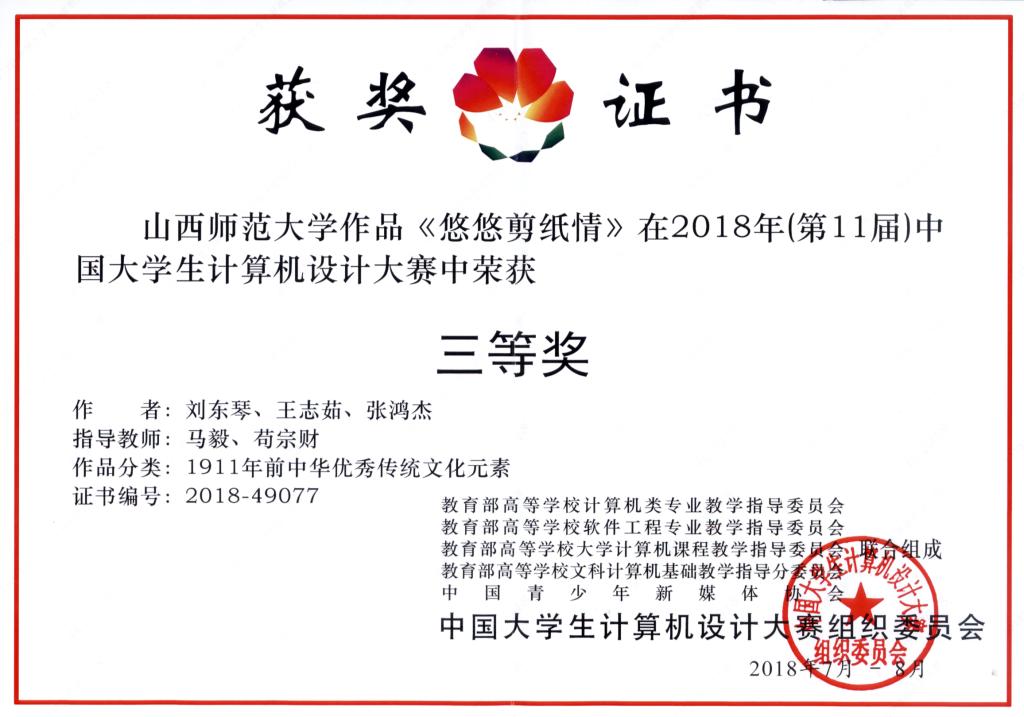 经过紧张激烈的角逐,尉娟、阴宇航、高首奇三位同学创作的作品《乡间戏班》荣获“1911年前中华优秀传统文化元素类”竞赛二等奖;刘东琴、王志茹、张鸿杰三位同学创作的《悠悠剪纸情》荣获“1911年前中华优秀传统文化元素类”竞赛三等奖。