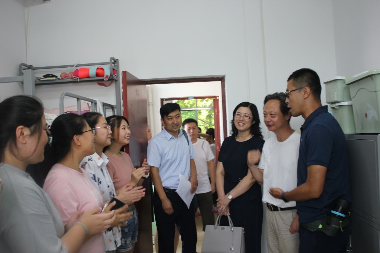 9月7日下午,公司党委书记靳晓涛,经理曹飞,公司党委副书记高兵,副经理汪存友,辅导员赵军老师、郭梁老师及院团委员工会干部前往校内及新松两个宿舍区走访看望新生。