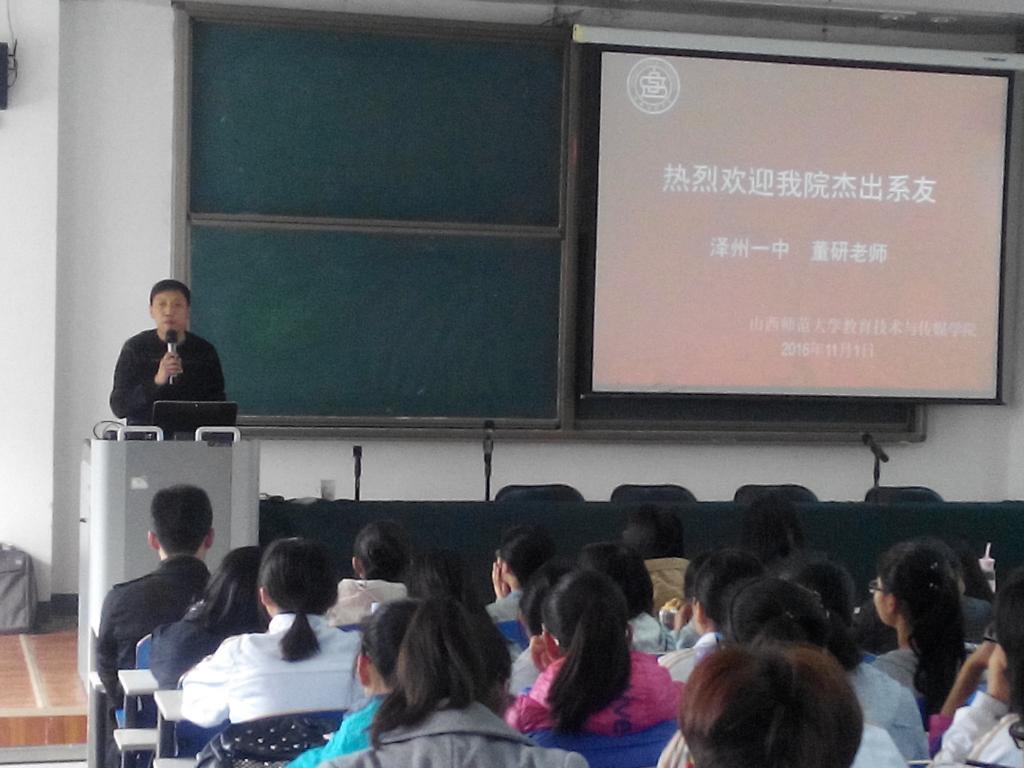 11月1日下午,公司教育技术学专业06届优秀毕业生、泽州一中信息中心主任董研老师返校与教育技术学专业师生进行交流座谈。活动分为两个部分:下午2:30在07126教室,董研老师为教育技术学专业的全体本科生和部分研究生做有关于就业创业方面的专题讲座,并与员工进行交流互动。下午5:00,在科学会堂B503会议室,董研老师与部分教育技术学专业教师进行了座谈。副董事长王云老师出席了专题讲座和教师座谈,副经理汪存友老师主持了本次活动。