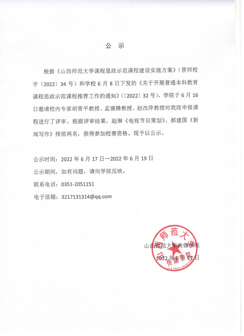 关于推荐教师参加公司课程思政示范课程评比的公示