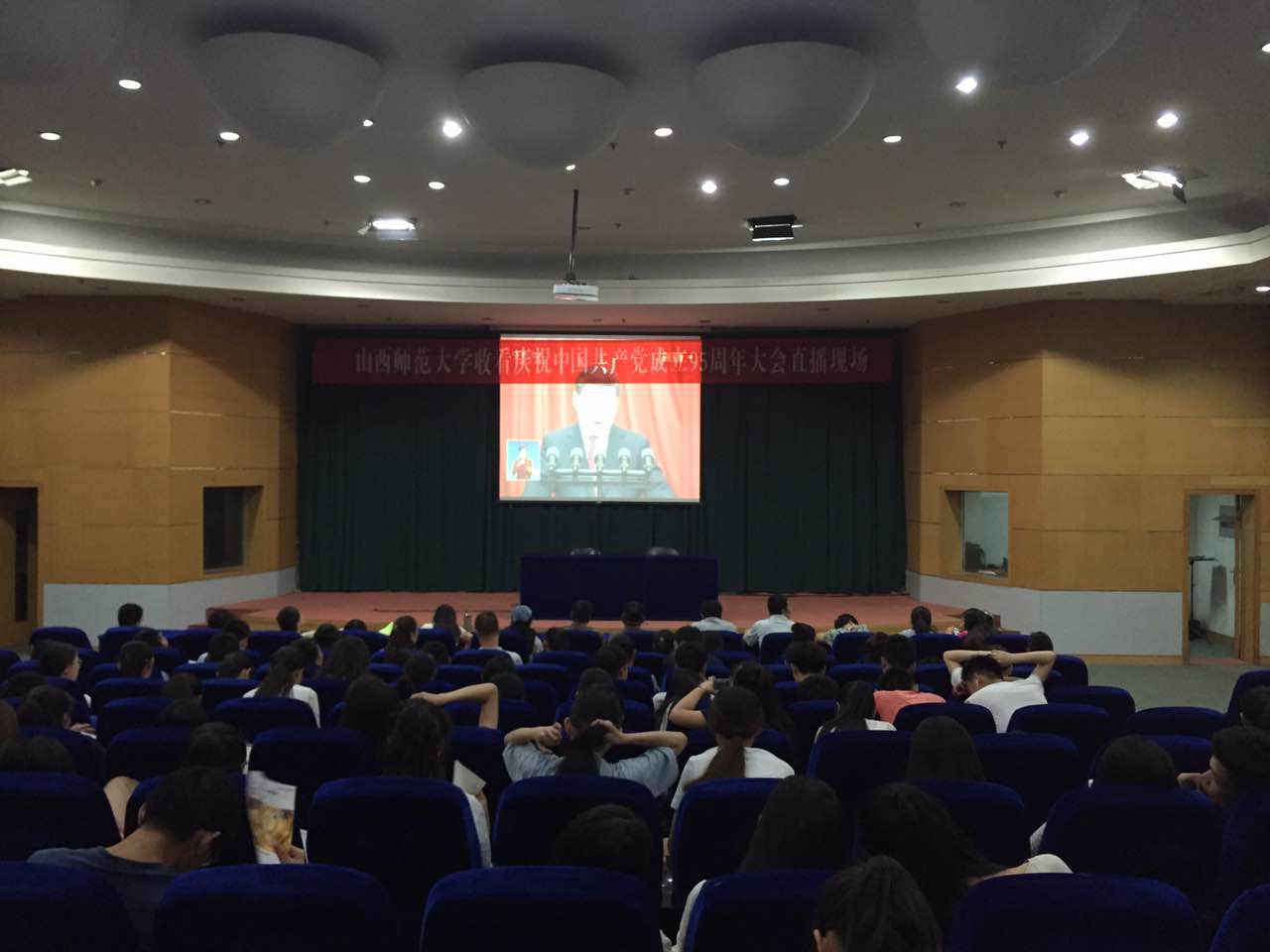 在科学会堂二层报告厅,全院师生党员、入党积极分子通过大屏幕共同观看电视直播,喜迎建党95周年。师生们聚精会神、仔细聆听、认真笔记、情绪高涨,不时对习近平总书记的讲话报以热烈的掌声。