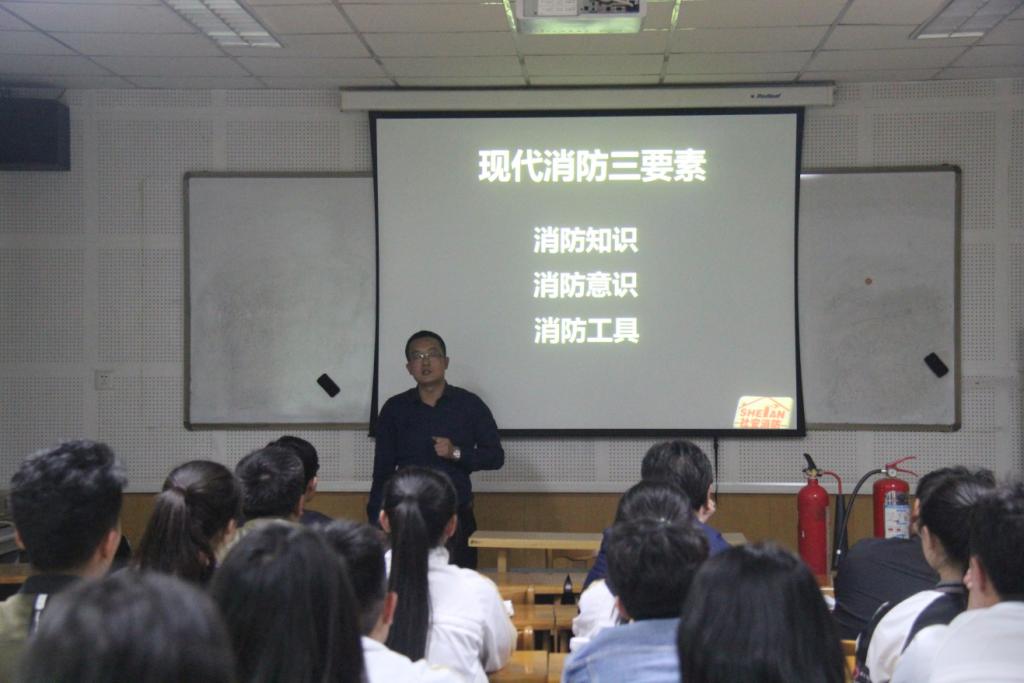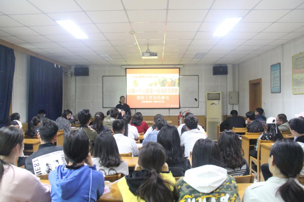 李志强教官从近几年重特大火灾事故的案例分析、消防器材的使用方法介绍、发生火灾时逃生方式的现场示范、灭火器的分类与使用等方面向大家作了知识讲授,同时也与现场师生进行了交流互动。李志强教官呼吁大家共同参与消防工作,让每一个人都成为一名消防志愿者。