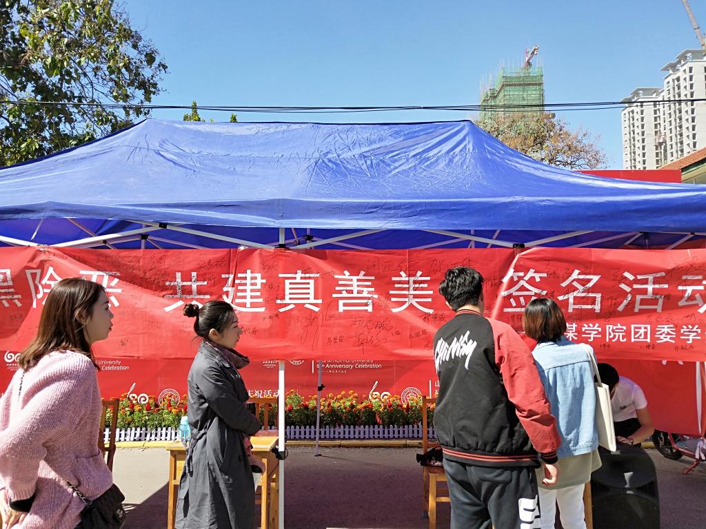 为了深入贯彻落实关于扫黑除恶专项斗争的相关指示精神,9月30日中午,FUN88乐天使团委员工会于校医院门口开展“扫黑除恶共建真善美”签名活动。