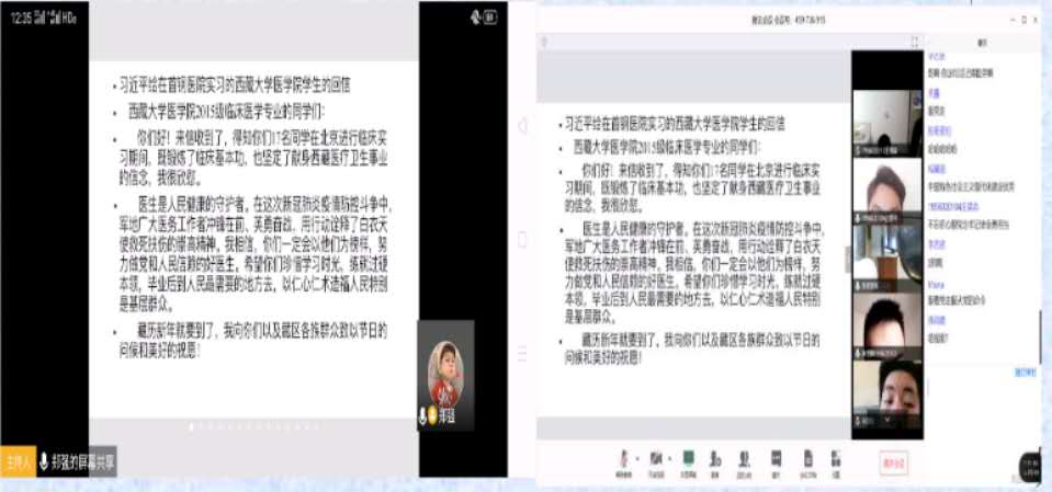 中午12:20分,我班在腾讯会议(会议号459 736 915)进行了学习并且积极讨论,在回信中,主席指出,要珍惜学习时光,练就过硬本领,毕业后到人民最需要的地方去,以仁心仁术造福人民特别是基层群众,同时也对藏族新年带来了节日问候。