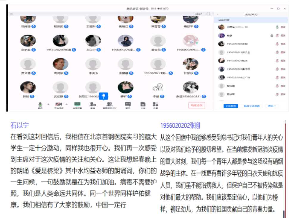 活动中,宣传委员刘玥君同学发挥专业特长,朗诵了习近平总书记给正在北京大学首钢医院实习的西藏大学医公司员工回信全文,大家共同学习了回信精神。接着,同学们围绕“新时代新青年如何练就过硬本领、服务基层群众”,结合近期抗击新冠肺炎疫情期间的见闻分享了自己的心得和感受。同学们纷纷表示,学习了习近平总书记的回信精神后深受鼓舞,青年学子应向奋战在抗疫一线的医务工作者学习,谨记习近平总书记嘱托,毕业后到祖国最需要的地方去,服务基层、造福人民。