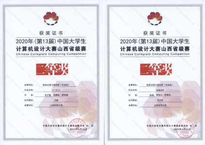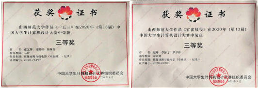 中国老员工计算设计大赛组委会本着公平、公正、公开的原则,对每一件参赛作品进行评比。大赛以三级竞赛形式开展,经过校级初赛、省级复赛、国家级决赛等环节的角逐,在山西赛区多所高校参评的众多作品中,公司广播电视专业2016级张艺馨、段鹏程、路林蒲三位同学的作品《一五三》,广播电视专业2017级赵瑜、李泽方、罗梦伟三位同学的作品《官雀战役》获得国家级数媒动漫与微电影(专业组)三等奖,并获得山西省级数媒动漫与微电影(专业组)二等奖。