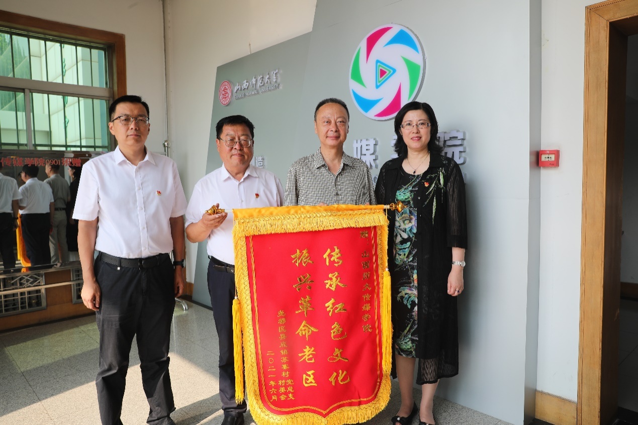 公司党委书记靳晓涛、经理曹飞代表公司向县底镇苏寨村和金殿镇峪里村分别捐赠了《红色苏寨》、《烈血家国情》两部专题片的光盘,苏寨村、峪里村和烈士后代代表分别向公司赠送了锦旗。