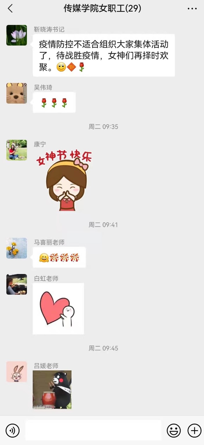 公司党委书记靳晓涛、经理曹飞和公司党委副书记、工会主席任茹新参加了活动并向全院女教师致以节日的祝福和问候,感谢她们对公司发展所做出的贡献。本次活动应疫情防控要求,采用线上老师们互送节日祝福、趣味猜谜、成语对答等多种活动形式,缓解了大家工作的疲惫和压力,又促进了同事间的感情,感受到了节日带给她们的喜悦。
