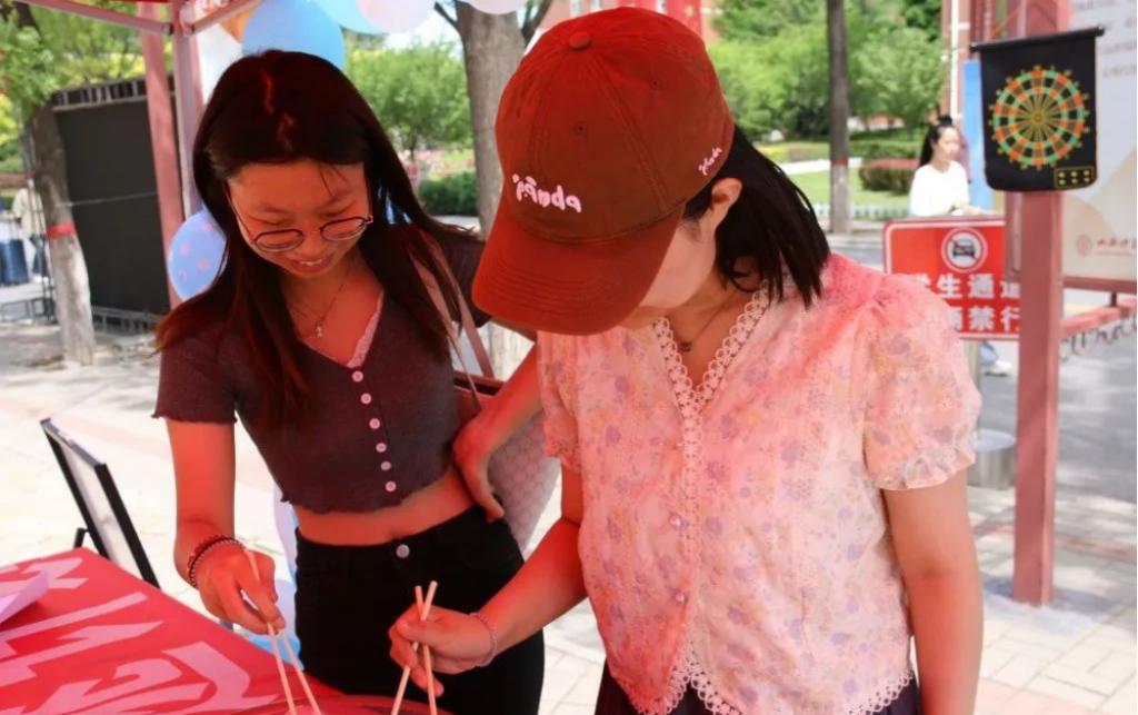 本次活动共设“盆中取球”“扔飞镖”“手抽纸杯”三个游戏项目。在活动现场,同学们积极地参与其中,每个游戏中大家好像都再次找到了童真。活动结束后,工作人员也为同学们发放了小零食和太阳花等小礼物。