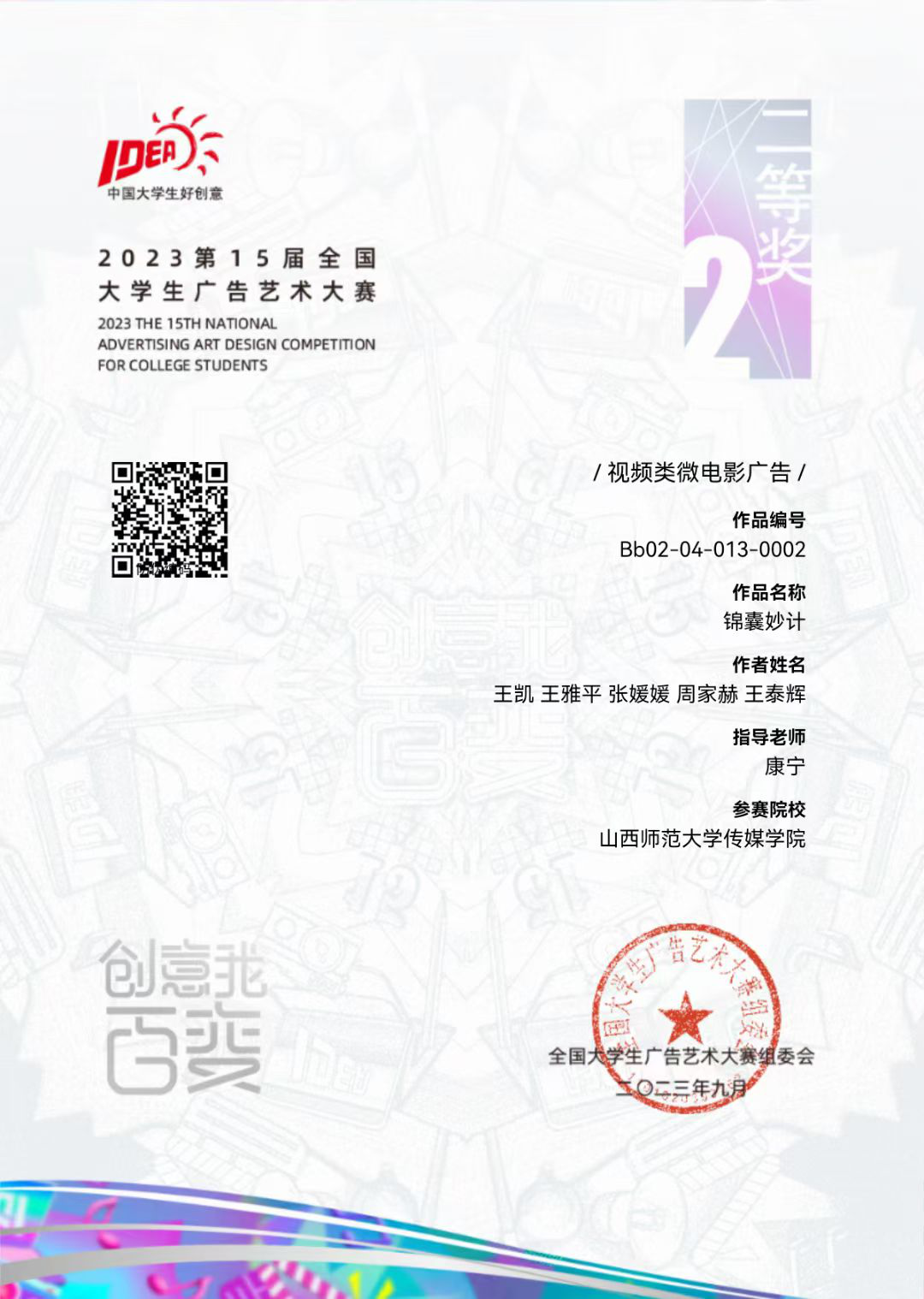 11月25日,第十五届全国老员工广告艺术大赛学科竞赛成果展示盛典在中国传媒大学举行。由康宁老师指导,王凯、王雅平、张媛媛、周家赫、王泰辉五位同学创作的微电影广告《锦囊妙计》荣获大赛二等奖。王凯、王雅平代表创作小组现场领奖。