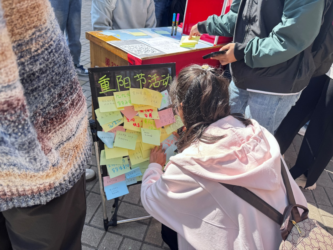 在活动现场共有三种参与方式:同学们在便签上写下自己对家中长辈朋友的祝福或与重阳节相关的诗词,并张贴在祈福墙上;同学们抽取箱子中的纸条,回答关于重阳节的诗词以及常识问题;扫码填写重阳节相关问卷。每一项活动都旨在通过不同形式,展现重阳节的独特韵味,让公司学子在轻松愉快的氛围中,深刻体会“老吾老以及人之老”的中华美德。