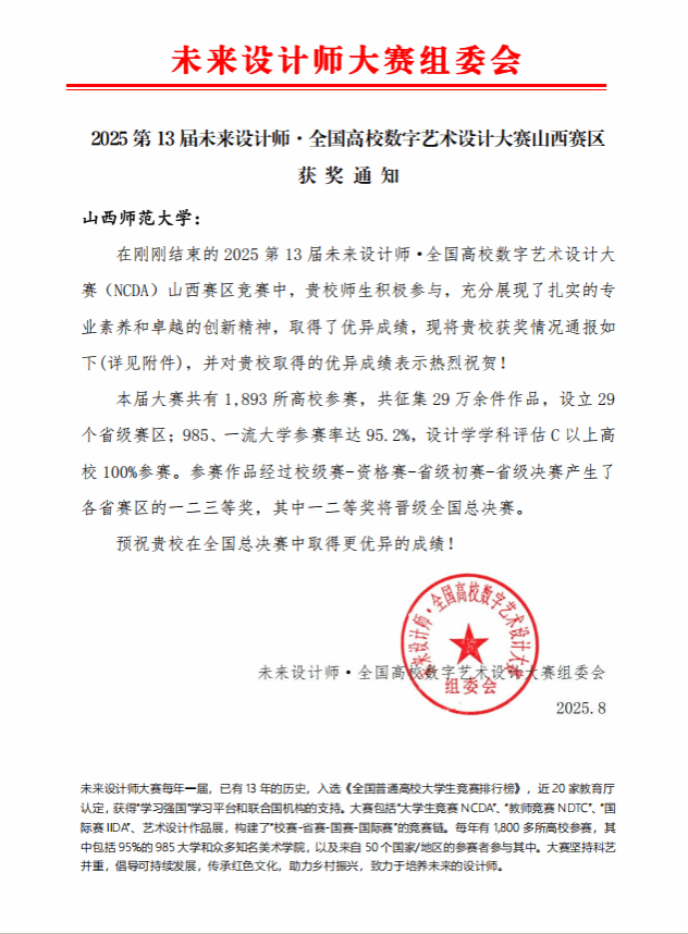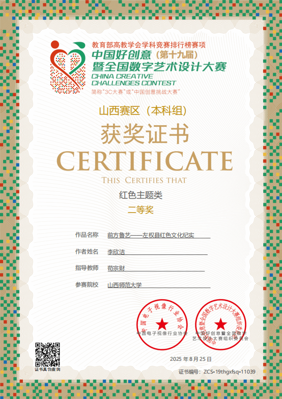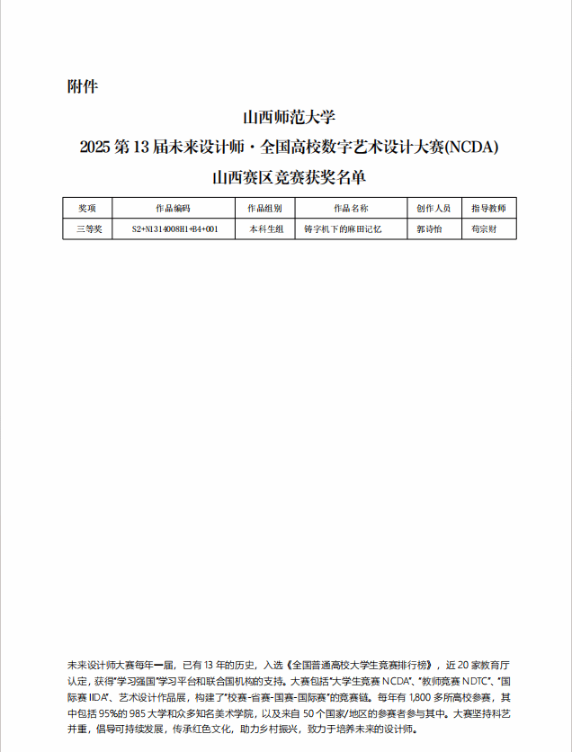 由公司张明超老师指导,范宇翔同学创作的《晋地回想》荣获“第十九届中国好创意暨全国数字艺术设计大赛”山西赛区中国风传统文化类二等奖;苟宗财老师指导,李欣洁同学创作的《前方鲁艺——左权县红色文化纪实》荣获“第十九届中国好创意暨全国数字艺术设计大赛”山西赛区红色主题类二等奖;苟宗财老师指导,郭诗怡同学创作的《铸字机下的麻田记忆》荣获“第十三届未来设计师·全国高校数字艺术设计大赛”山西赛区三等奖。
