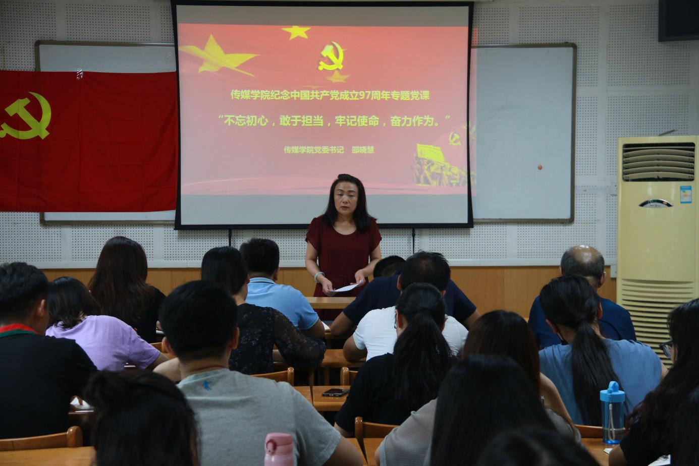 公司党委书记邵晓慧简要介绍了公司党委下发的《关于开展庆祝中国共产党成立97周年活动的通知》文件精神。她强调,讲授本次党课是为了深入学习贯彻习近平新时代中国特色社会主义思想和党的十九大精神,激励全院师生党员在新时代要有新担当、新作为。她主要从“什么是共产党人的初心、共产党人的责任担当和奋力作为”两个方面做了深刻的讲解。