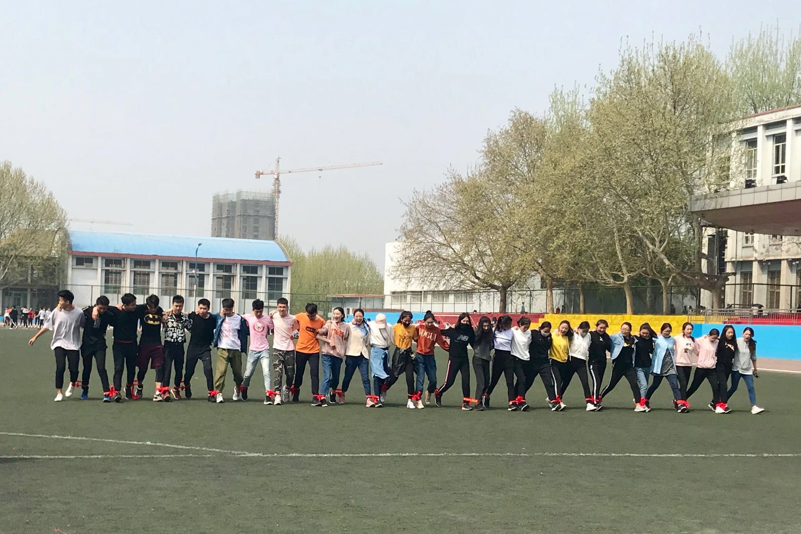 比赛以两人三足为原型,各班30人为一队,采取两两对决方式,淘汰晋级。所有参赛队员在起点后站成一横排,左右相邻员工将腿绑在一起在一起,采用站立式起跑。比赛开始,大家听哨声后同时起步,相互搀扶,按着嘴里的口号努力向前,大家团结一致,操场上的口号声和加油声也此起彼伏,掌声也不断的响起。队员们之间相互鼓励,相互帮扶彰显着他们的团队向心力,凝聚力,展现了自己的青春风采。经过一番激烈的角逐,最终,空一和空三以及播音班分别以44.38秒、44.64秒、47.88秒的成绩位列前三。