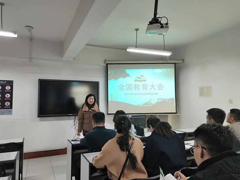 首先,院团委书记杨谨瑜老师为大家讲解了《全国教育大会》会议内容及习近平总书记重要讲话中对教育“国之大计党之大计”的定位。随后,杨谨瑜老师同大家对“九大坚持”、“六个下功夫”、坚决杜绝以“五个唯”衡量人才以及广大教师要承担起“三个传播”、“三个塑造”的时代重任四个方面进行了着重学习。她希望党支部的同学们可以起到带头作用,做新时代社会主义的“六有青年”。