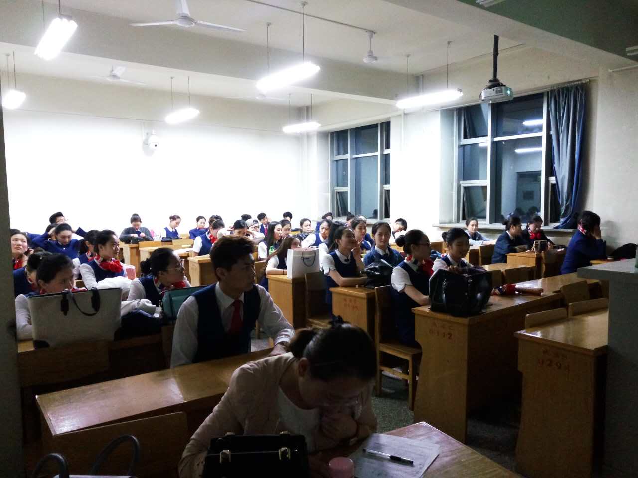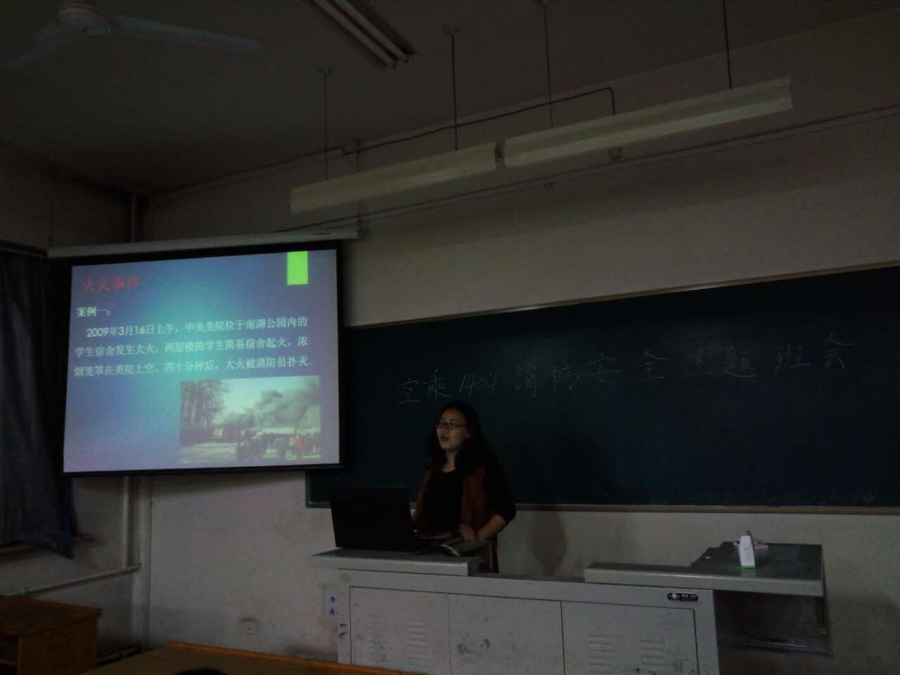 2016年4月26日晚,空乘1404班开展了“消防安全”主题班会,班会由辅导员黄云芳老师主持,班级同学全员参与。