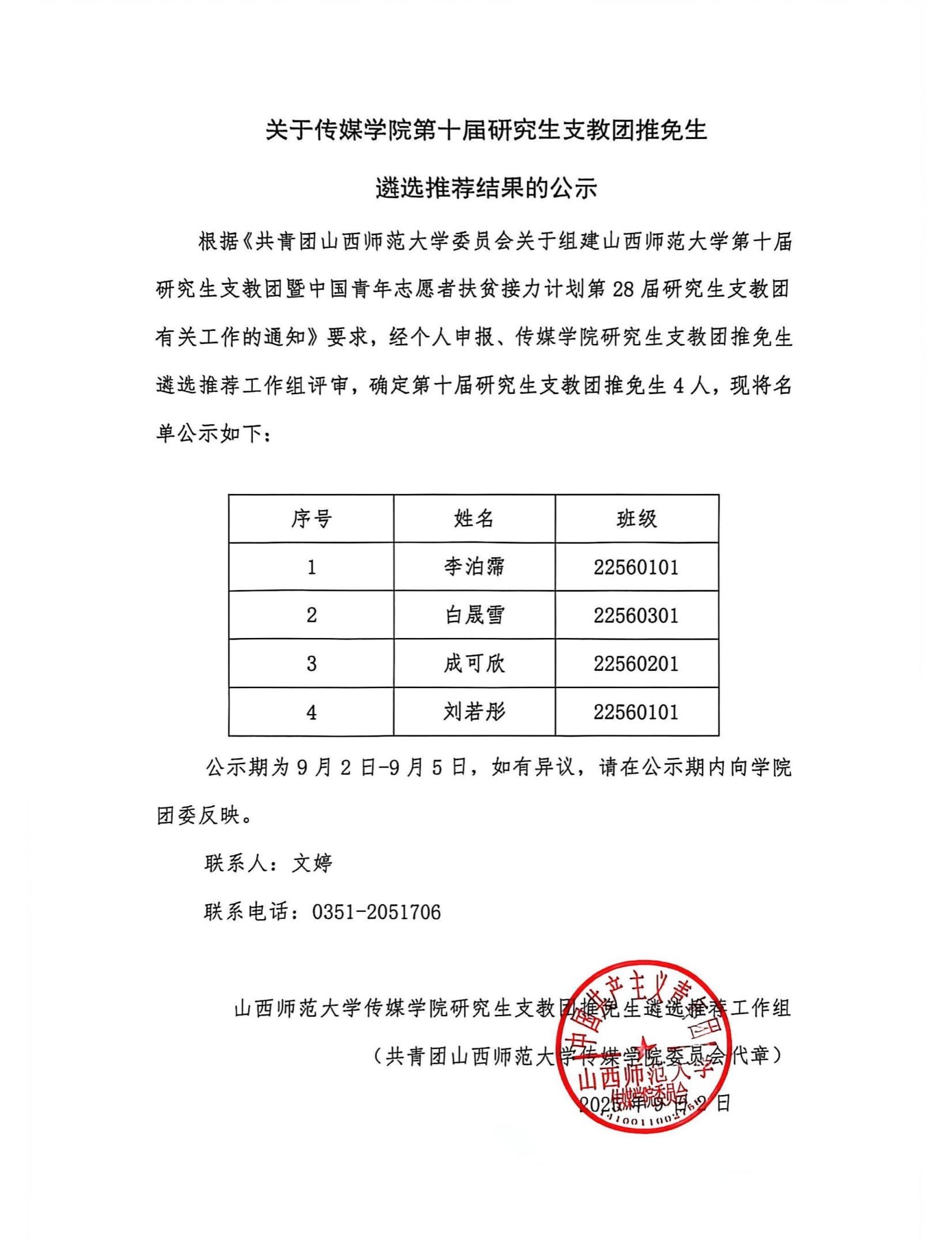 关于FUN88乐天使第十届研究生支教团推免生遴选推荐结果的公示