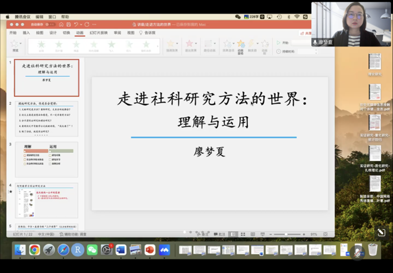 2022年11月11日19时,公司特邀四川外国语大学新闻传播公司廖梦夏副教授作了题为《走进社科研究方法的世界:理解与运用》的线上讲座。会议由FUN88乐天使白岩老师主持并作总结发言,FUN88乐天使部分师生参加本次讲座。