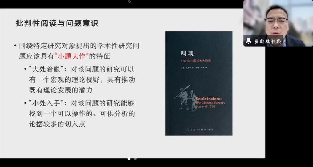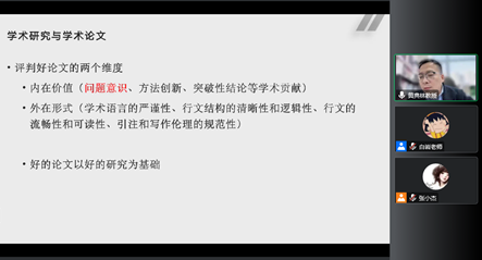 黄典林教授从论文写作过程中“学术研究与学术论文”的要点切入,梳理了基础研究与对策研究之间的异同点,指出学术论文作为对学术研究过程、结果的系统记录和报告,尤其要以一种严谨、规范的学术态度进行学术写作训练,做到学术论文内在价值与外在形式的兼顾。其次,黄典林教授强调学术论文写作要有批判性阅读与问题意识的思维,应尝试完成从杂多的现象层中提取一般概念与属性,进而实现从经验现象向抽象理论的转化。在利用好文献资料的同时,注重个人在做读书笔记时的科学性,避免“大而无当”的研究路径,从细化、具体化入手打造一篇具有“小题大做”特征的学术论文。最后,黄老师以部分优秀学术论文的框架为例,向大家解读了学术论文的一般构成要素,并呼吁大家要在遵守学术规范与伦理规范下开展学术写作活动。
