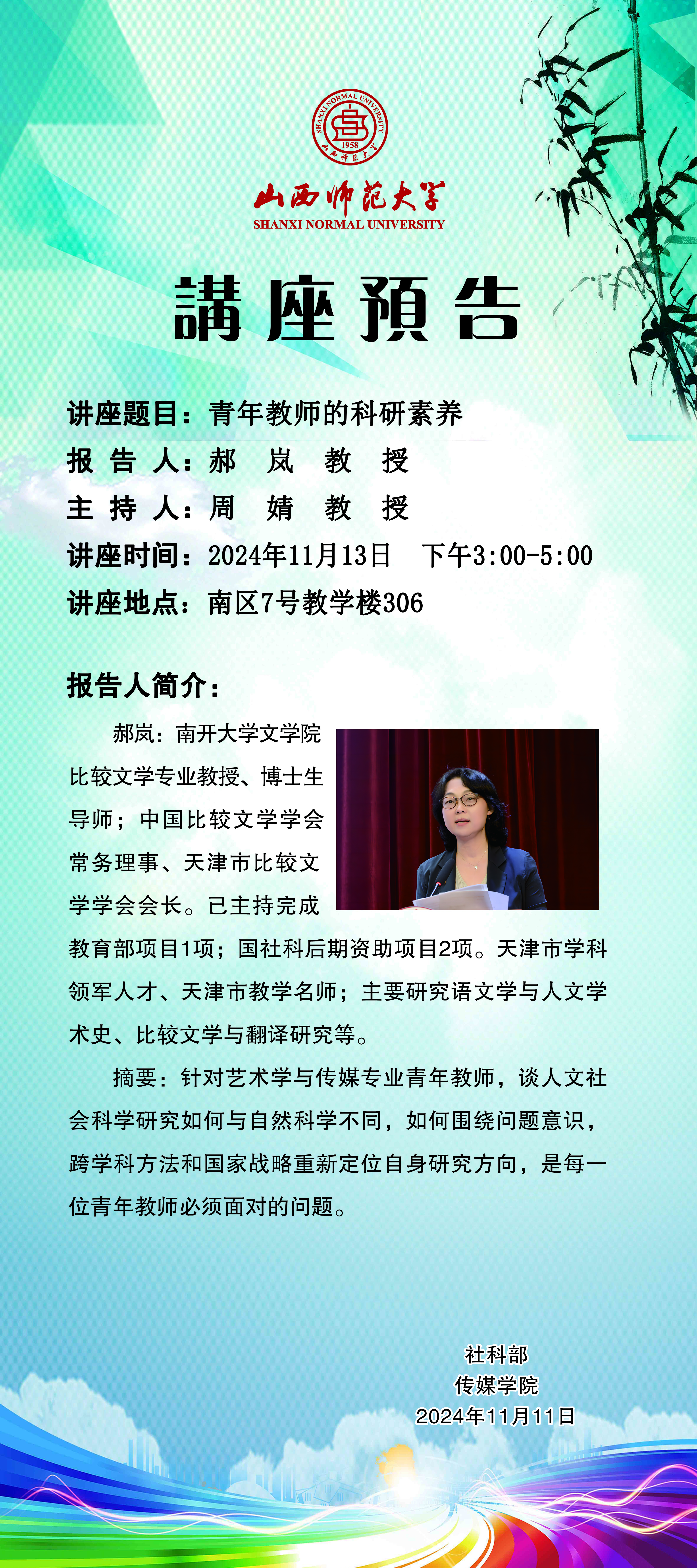 2024年11月13日下午3点,公司特邀南开大学文公司郝岚教授通过线上方式作了题为“青年教师的科研素养”专题讲座。本次报告是FUN88乐天使2025年度国家社科基金申报精品系列讲座之一,由FUN88乐天使副经理(主持行政工作)周婧主持,FUN88乐天使部分青年教师聆听了此次讲座。